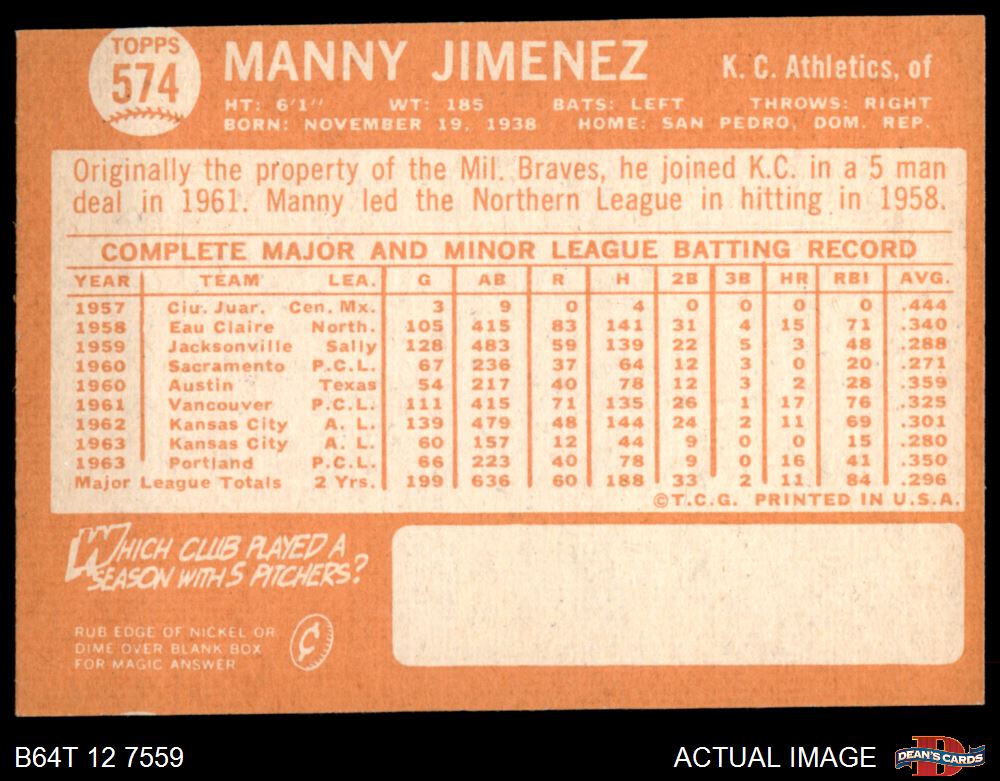 1964 Topps #574 Manny Jimenez 2 - GOOD