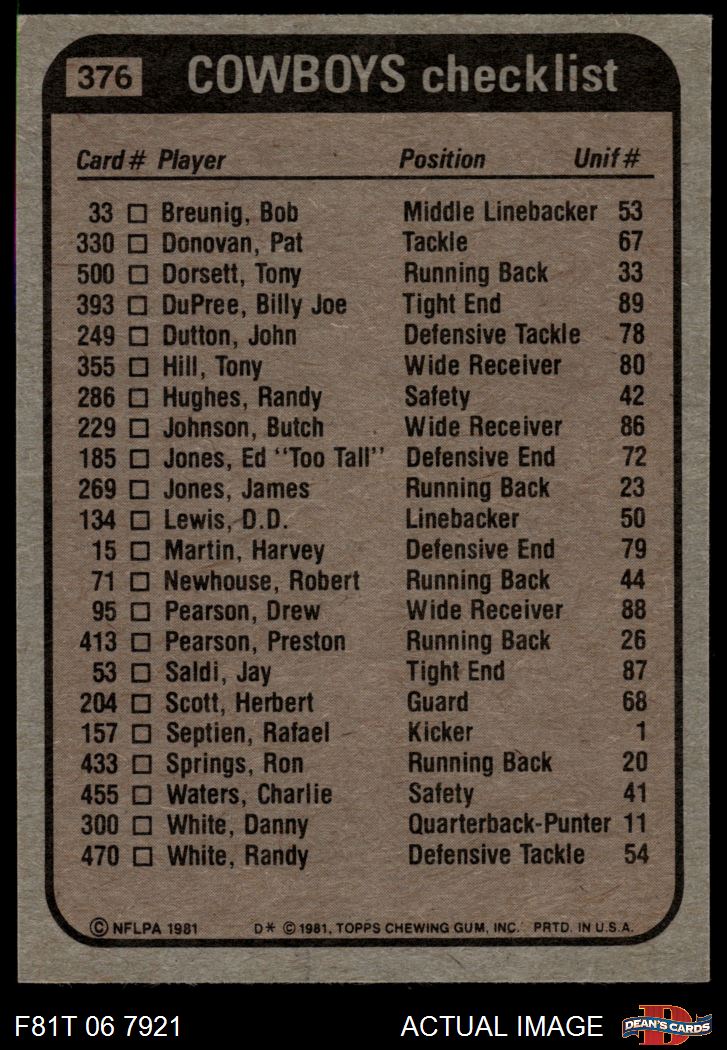 1981 Topps #376 - Tony Dorsett / Tony Hill / Dennis Thurman / Charlie Waters / Harvey Martin Cowboys Leaders & Checklist 4 - VG/EX