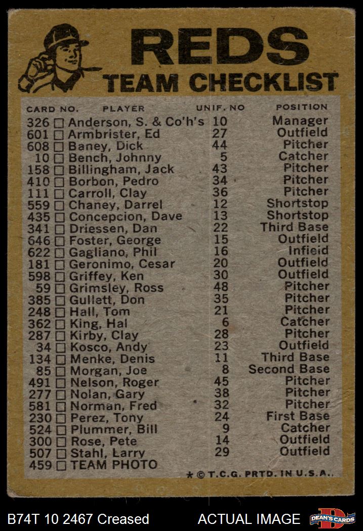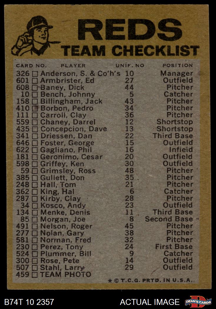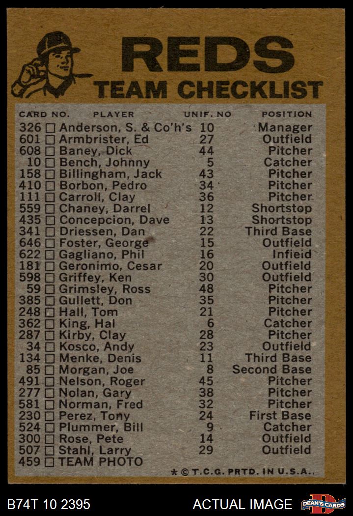 1974 Topps Red Team Checklist Cincinnati Reds Red Team Checklist