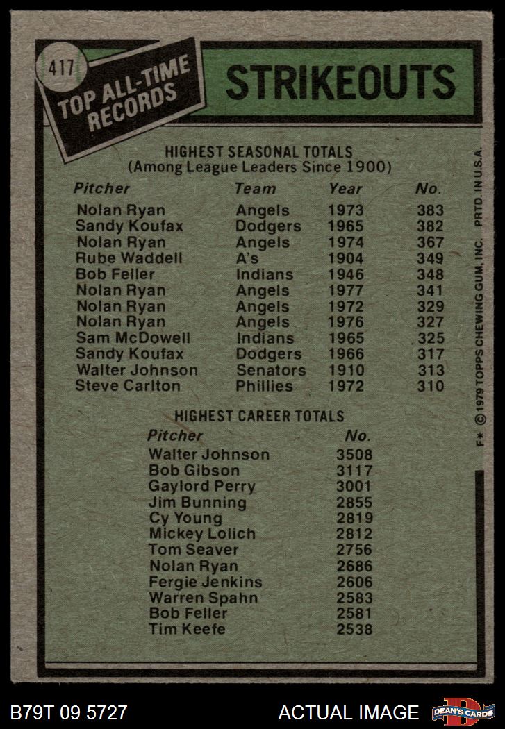 1979 Topps #417 - Nolan Ryan / Walter Johnson All-Time Record Holders - Strikeouts 2.5 - GD+