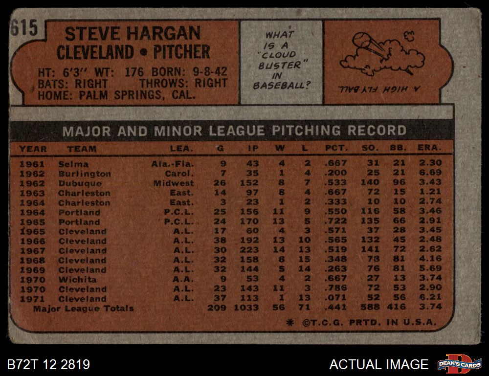 1972 Topps #615 Steve Hargan 1 - POOR