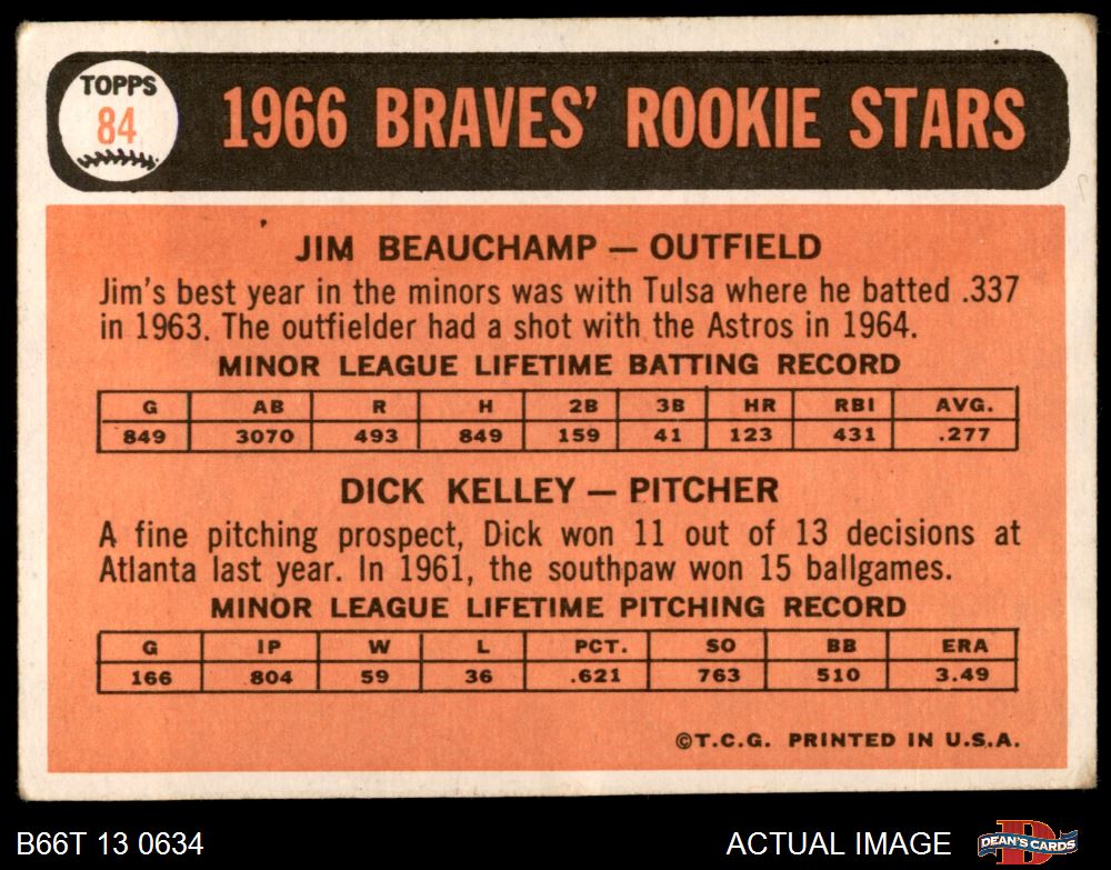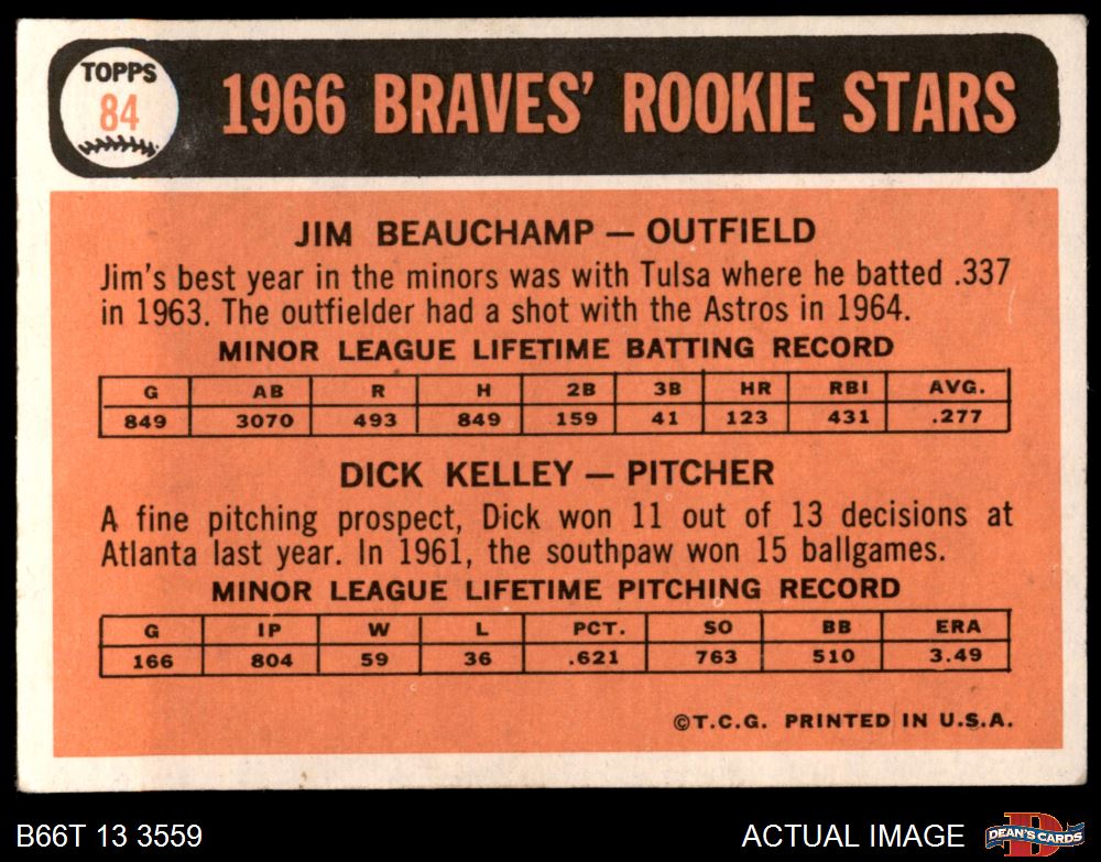 1966 Topps #84 - Jim Beauchamp / Dick Kelley Braves Rookies 2 - GOOD