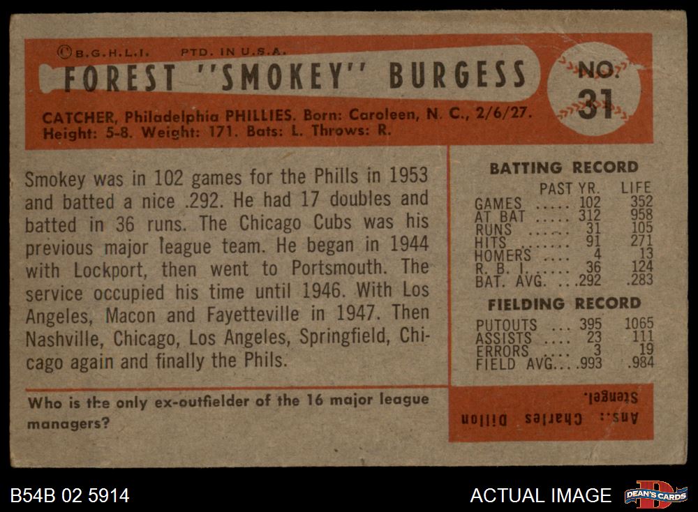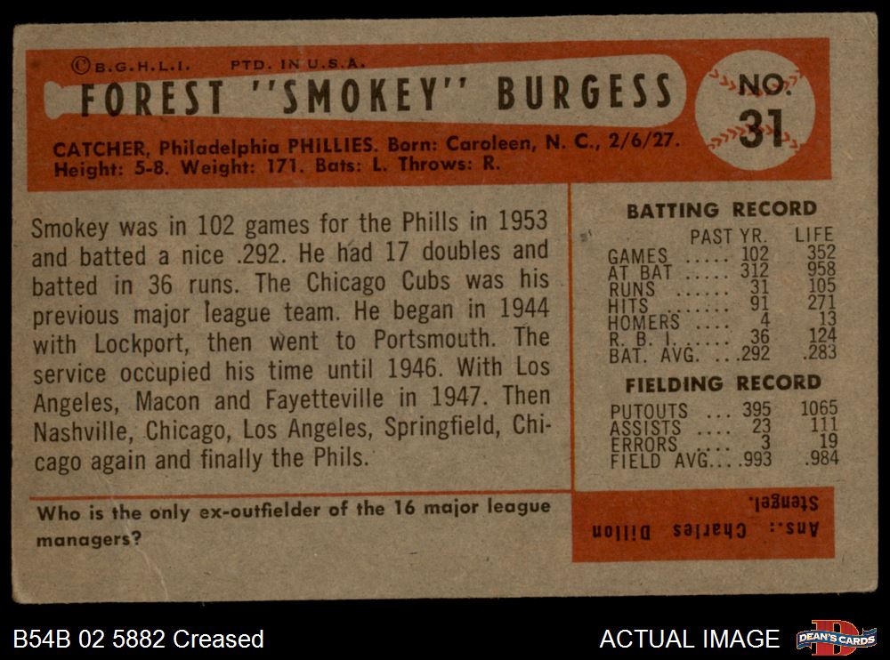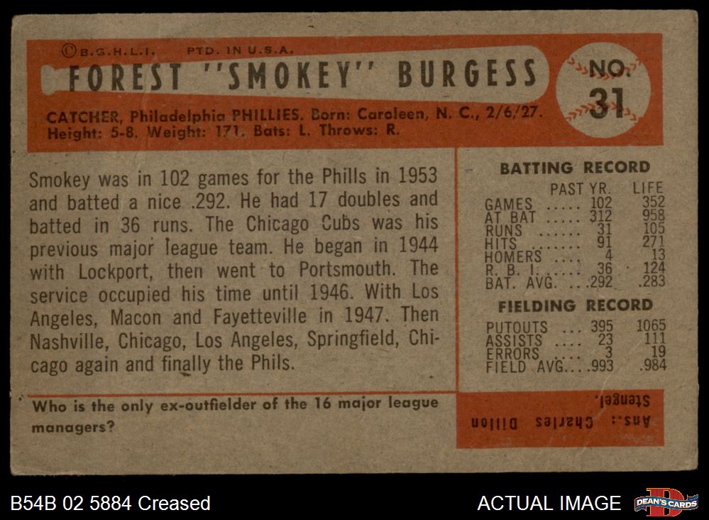 1954 Bowman #31 Smoky Burgess 2 - GOOD
