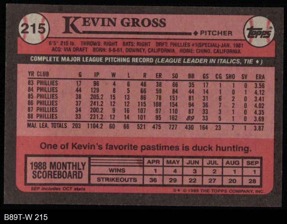 1989 Topps #215 Kevin Gross 8 - NM/MT
