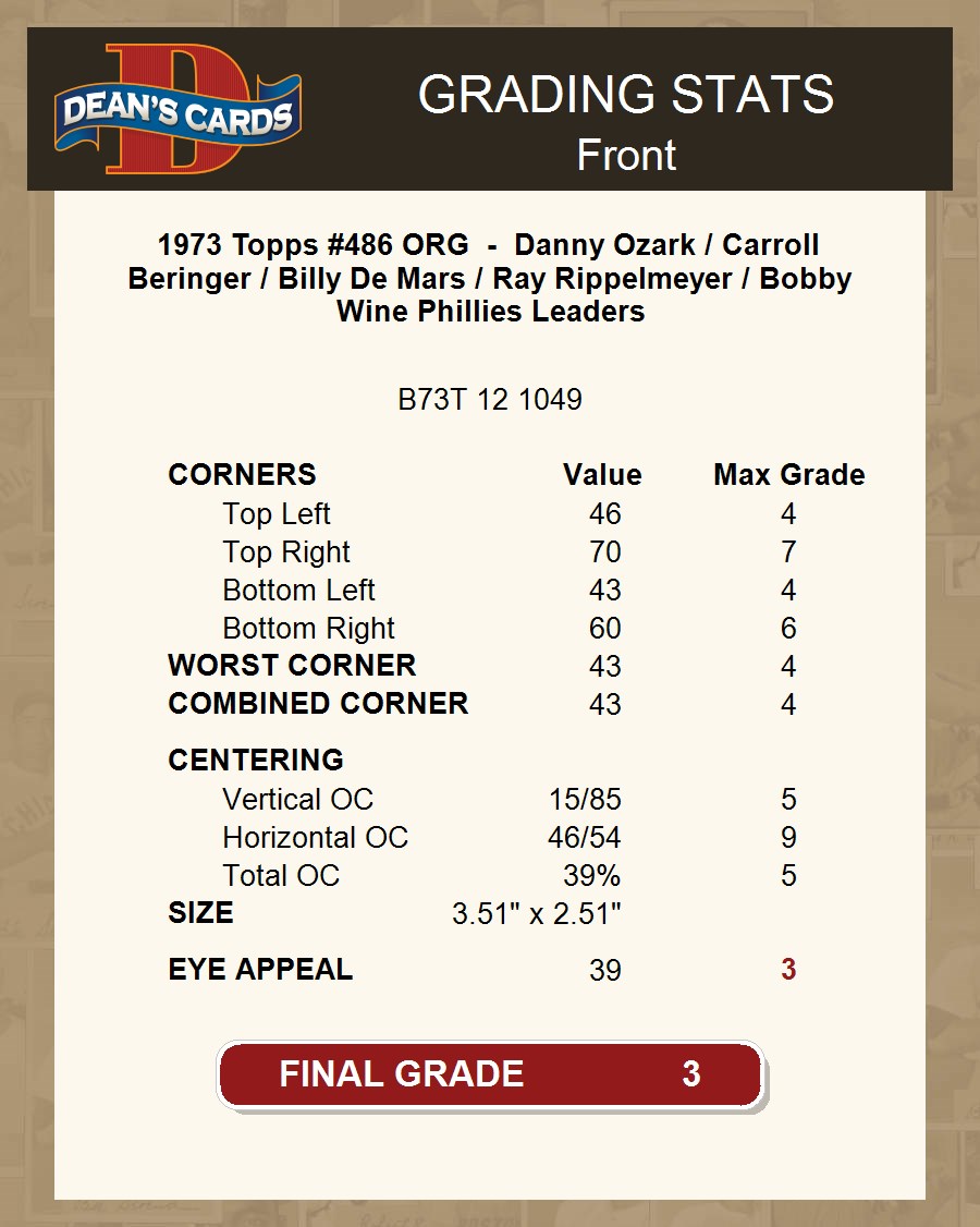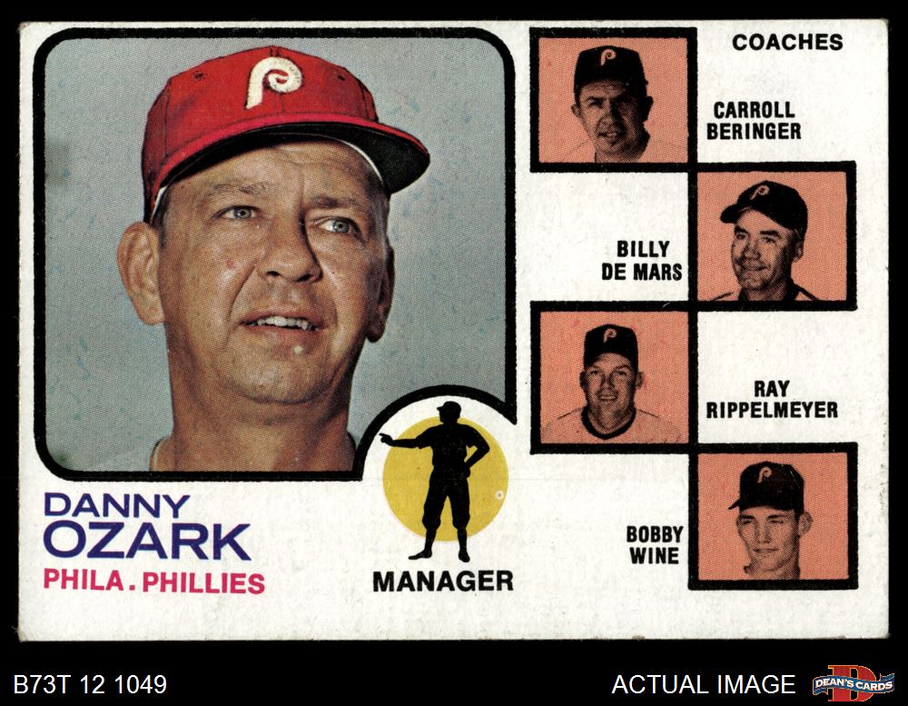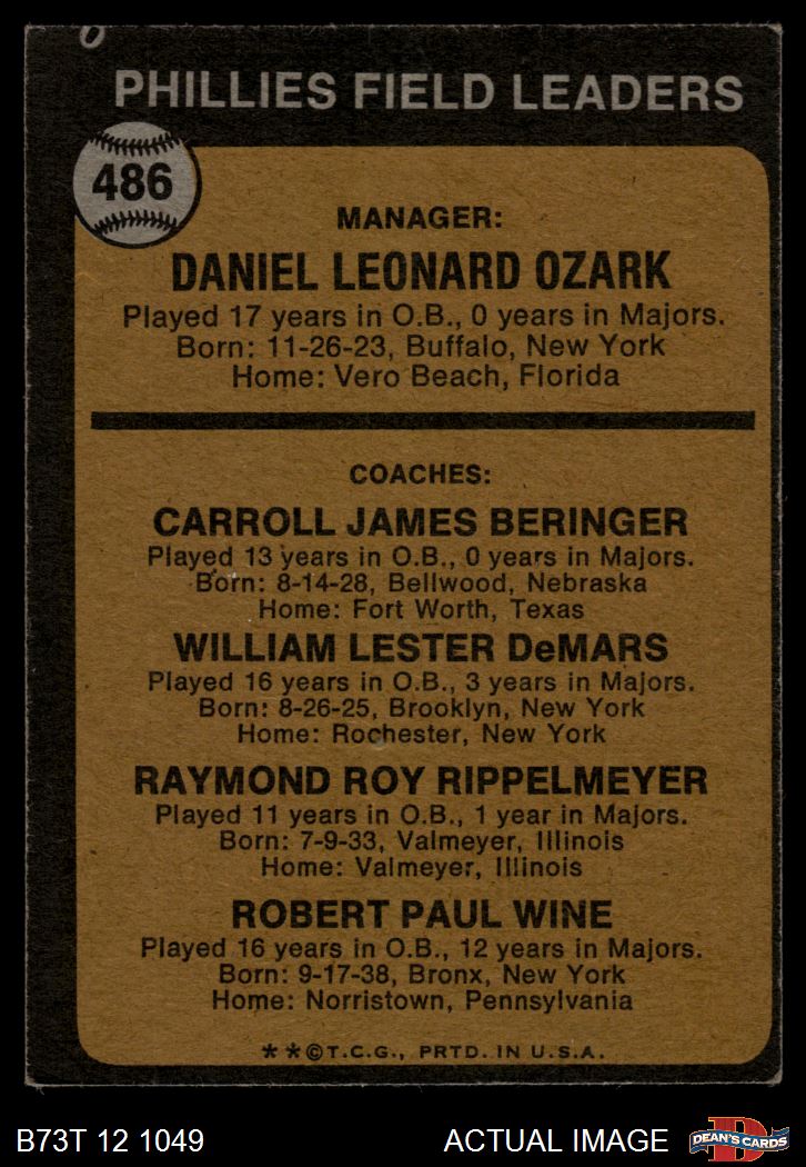 1973 Topps #486 ORG - Danny Ozark / Carroll Beringer / Billy De Mars / Ray Rippelmeyer / Bobby Wine Phillies Leaders 3 - VG