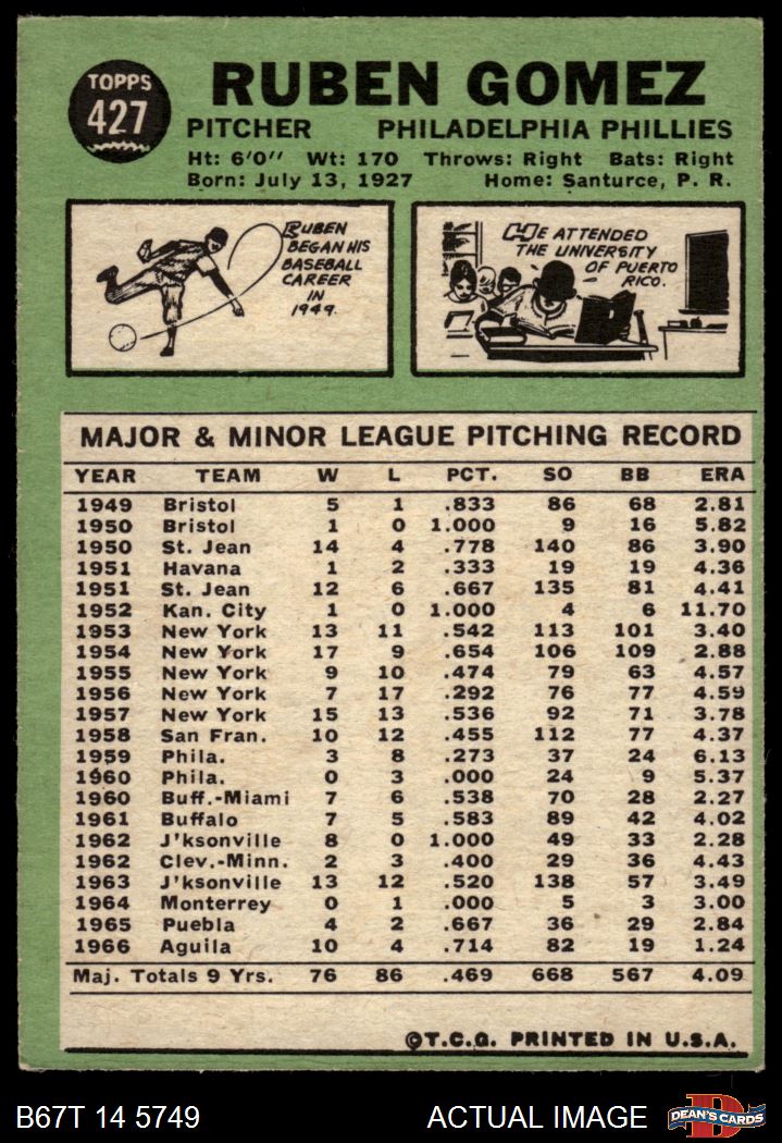 1967 Topps #427 COR Ruben Gomez 3 - VG