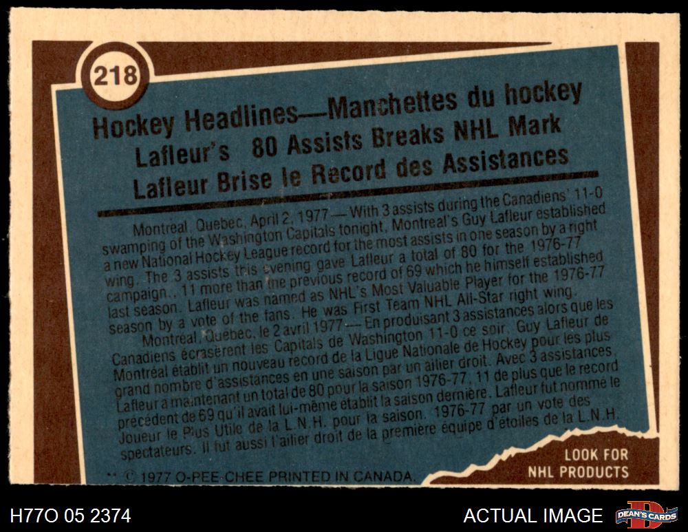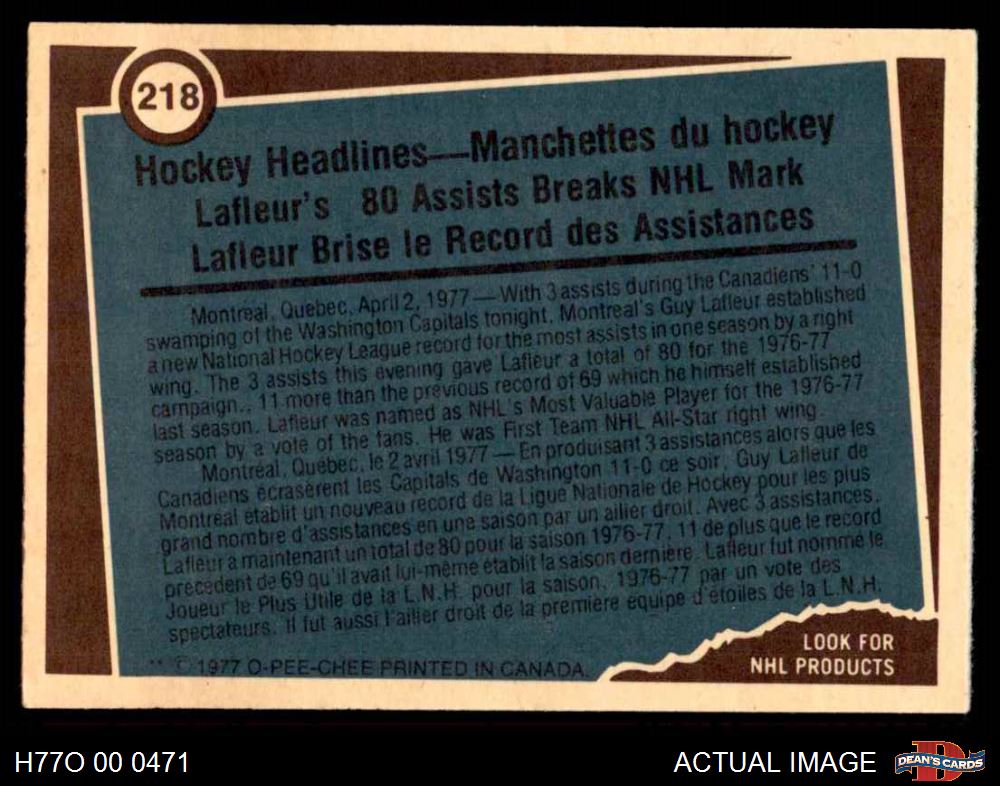 1977 O-Pee-Chee #218 - Guy Lafleur Record Breaker 4 - VG/EX