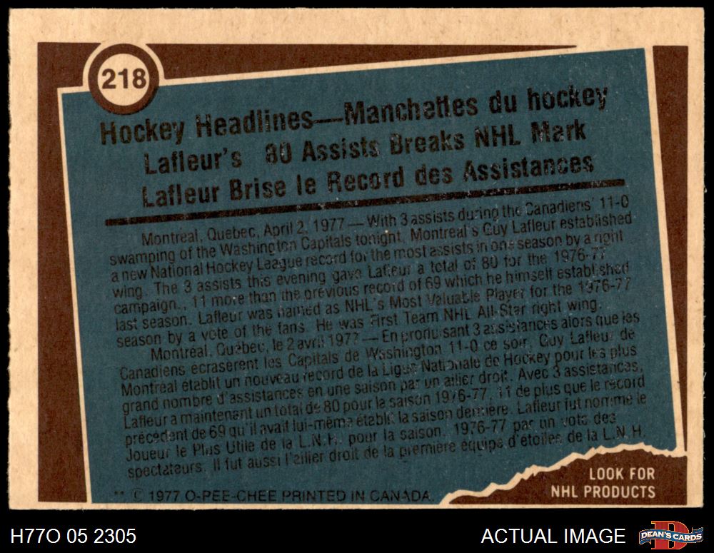 1977 O-Pee-Chee #218 - Guy Lafleur Record Breaker 6 - EX/MT
