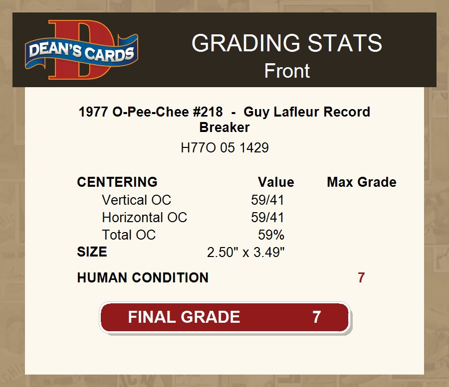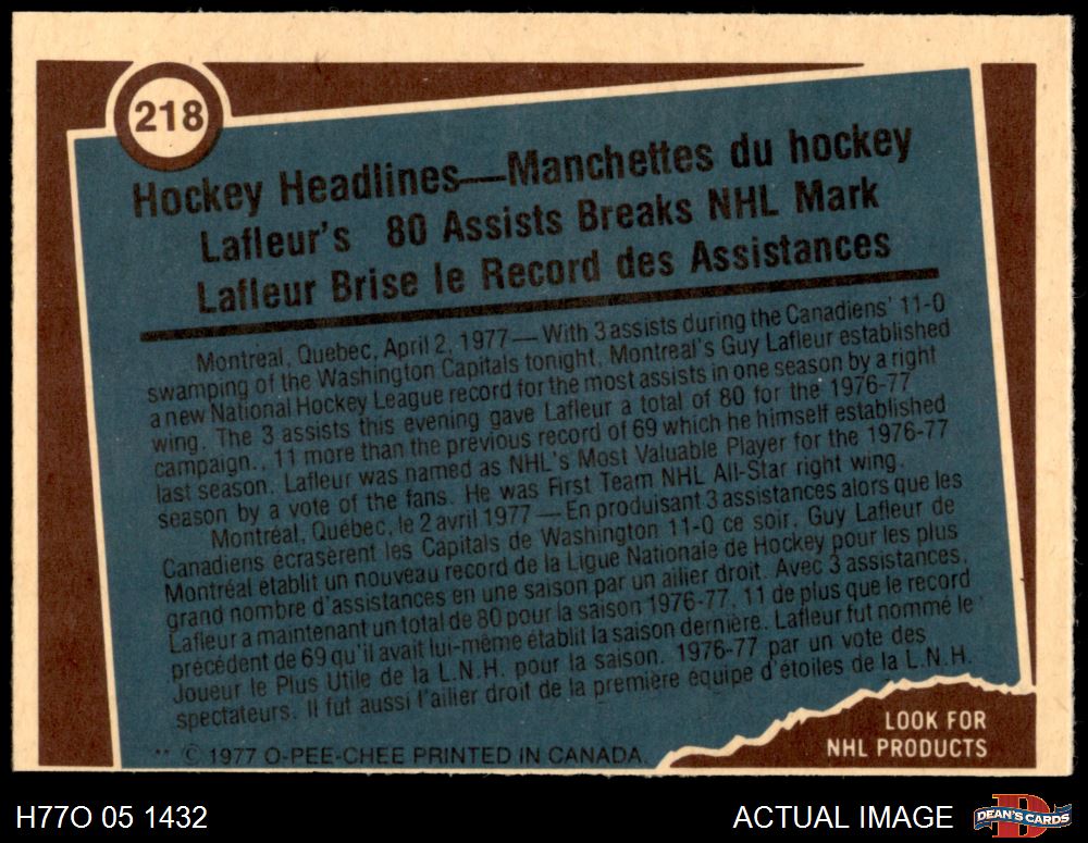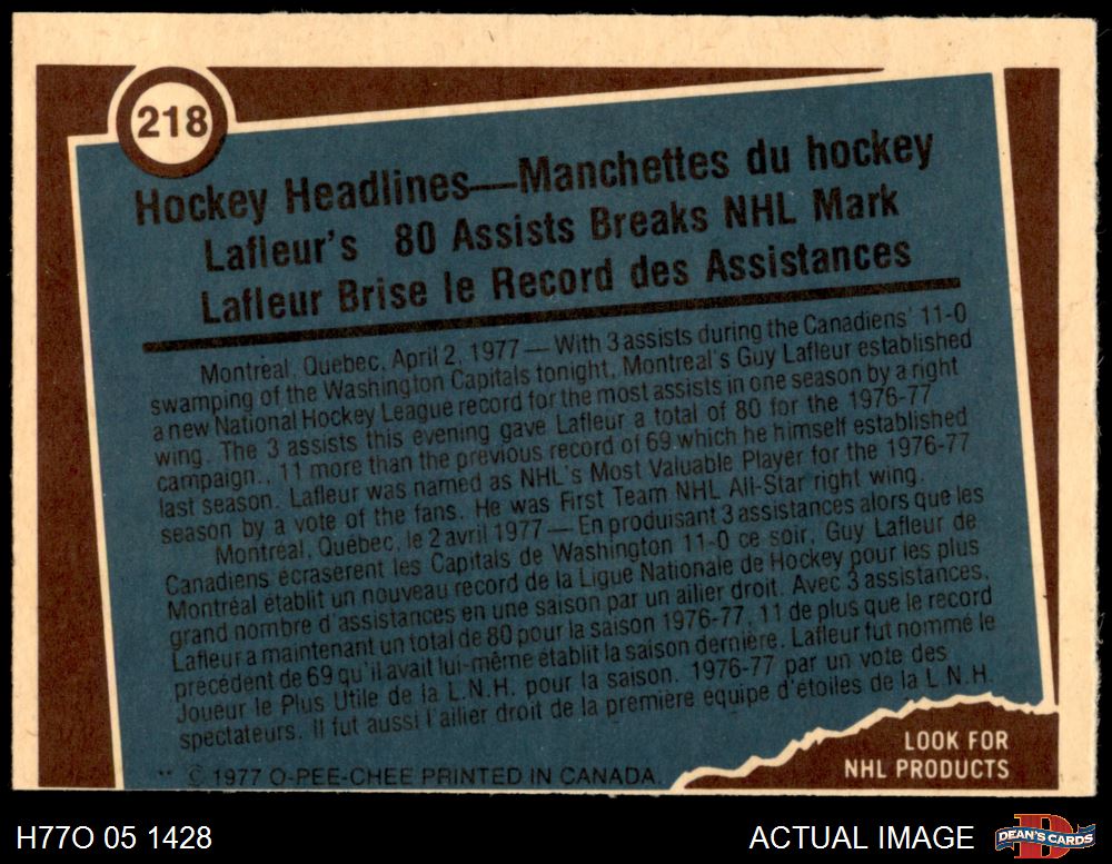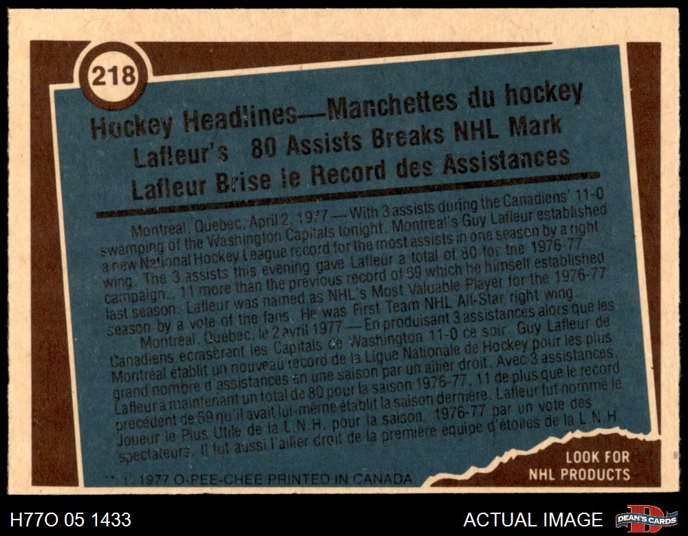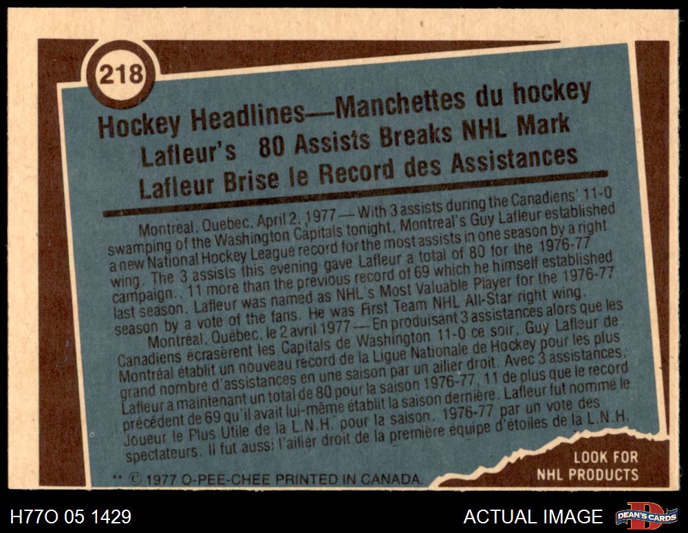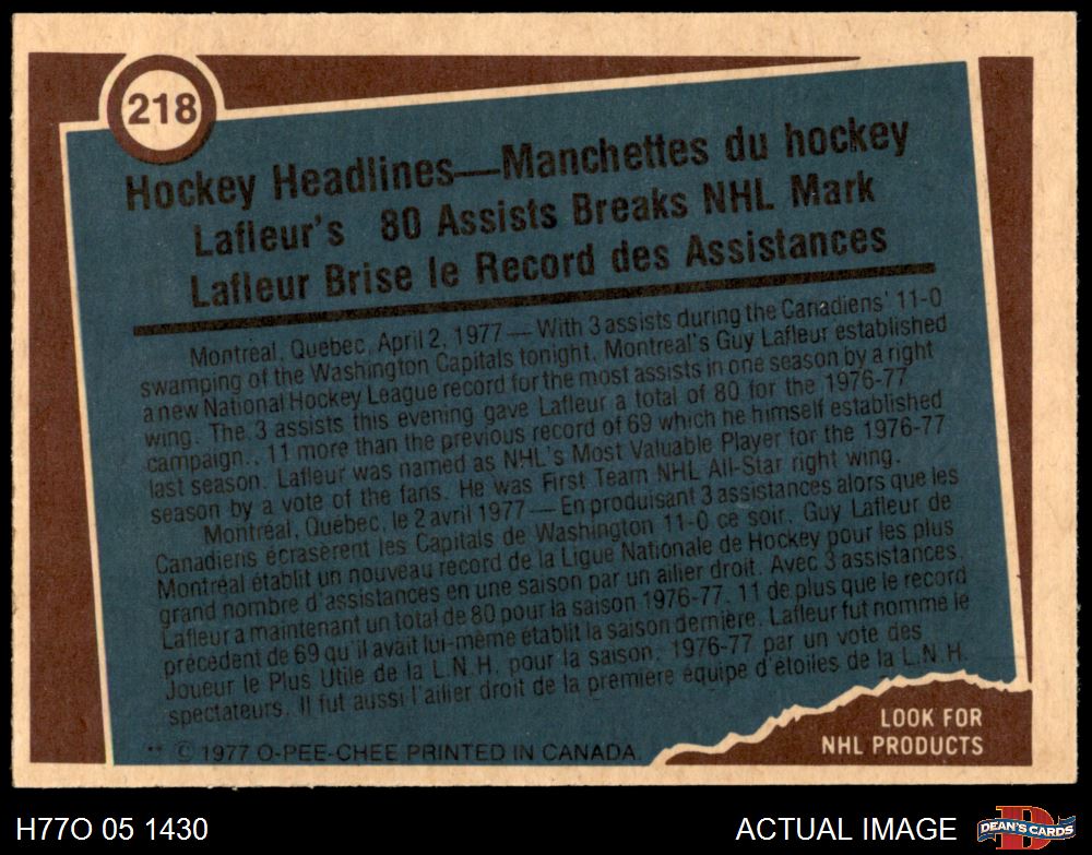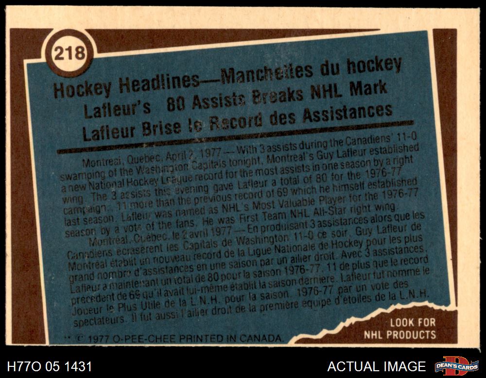 1977 O-Pee-Chee #218 - Guy Lafleur Record Breaker 7 - NM