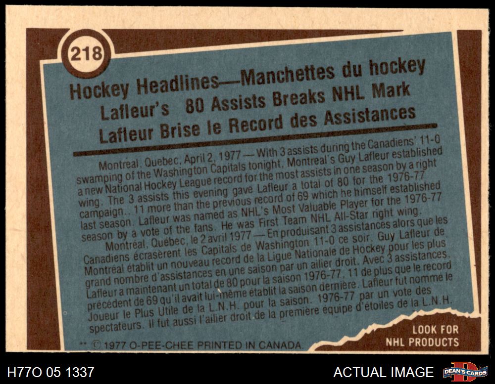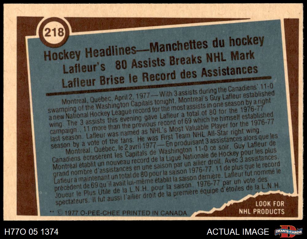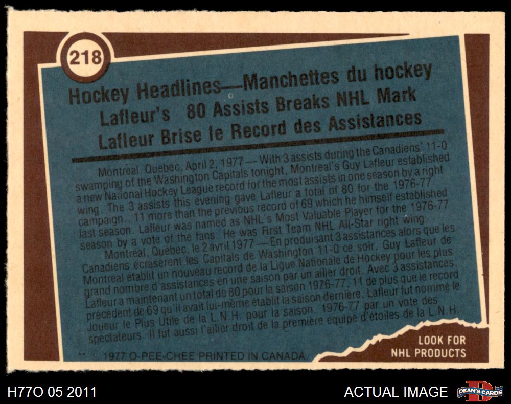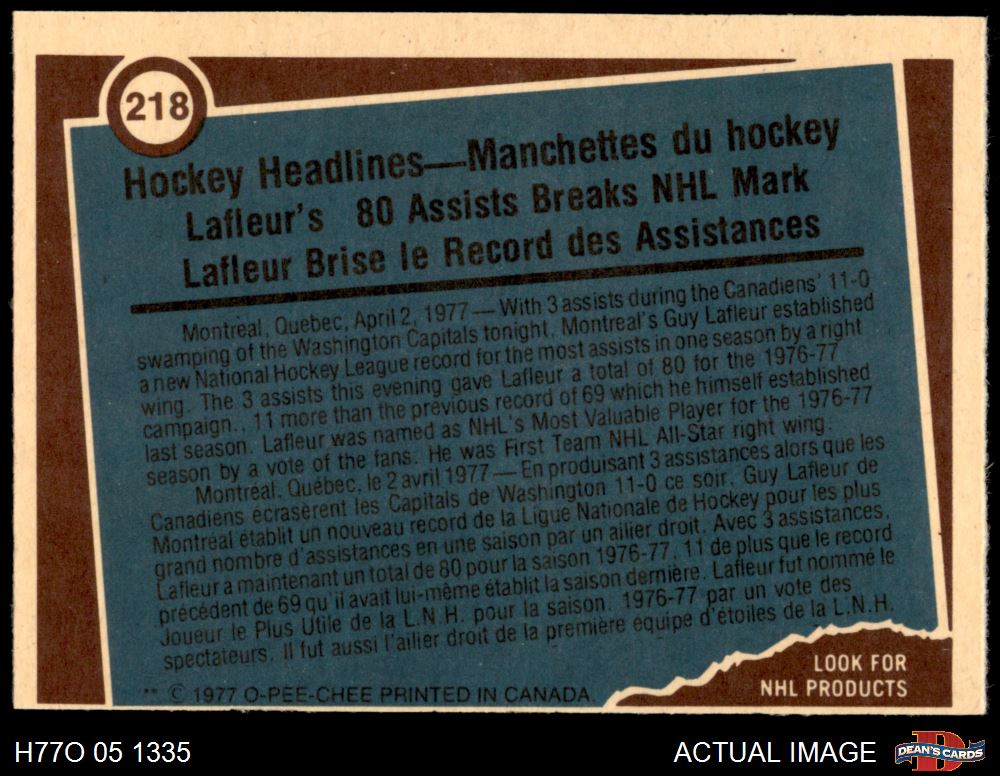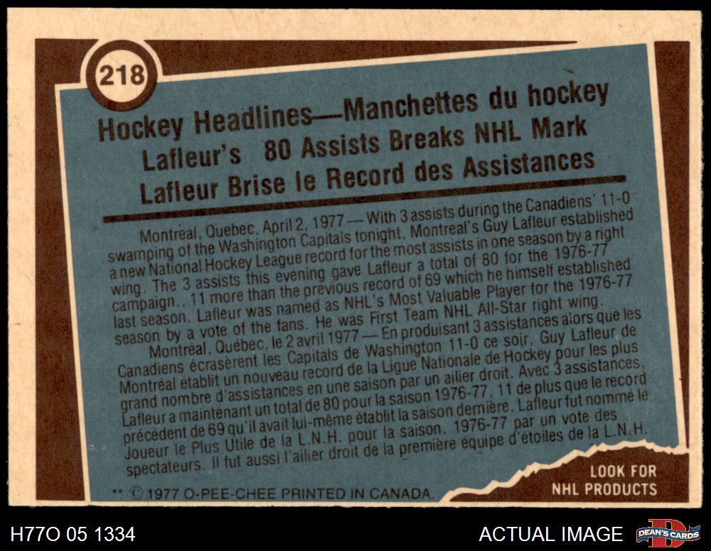 1977 O-Pee-Chee #218 - Guy Lafleur Record Breaker 8 - NM/MT