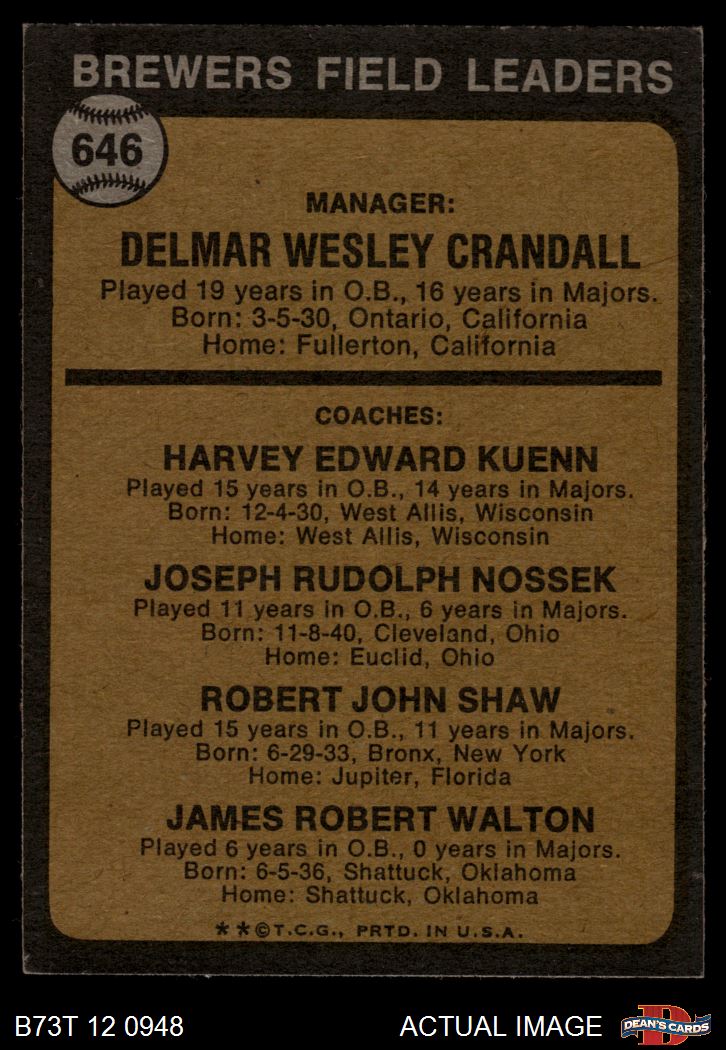 1973 Topps #646 - Del Crandall / Harvey Kuenn / Joe Nossek / Bob Shaw / Jim Walton Brewers Leaders 5 - EX