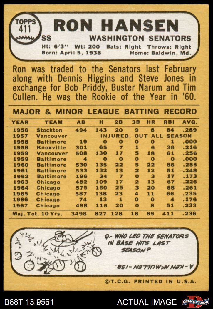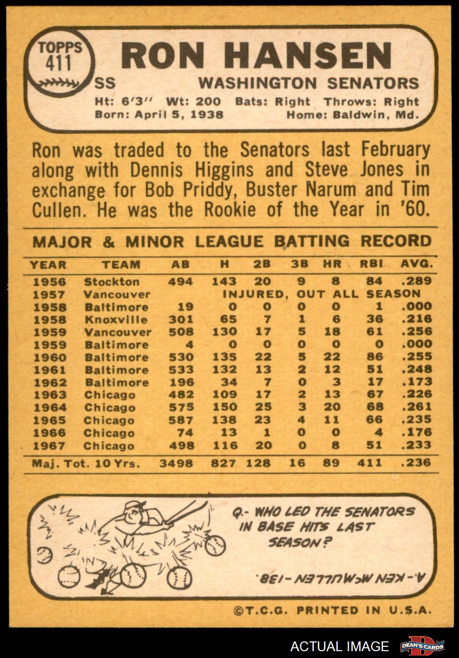1968 Topps #411 Ron Hansen 8 - NM/MT