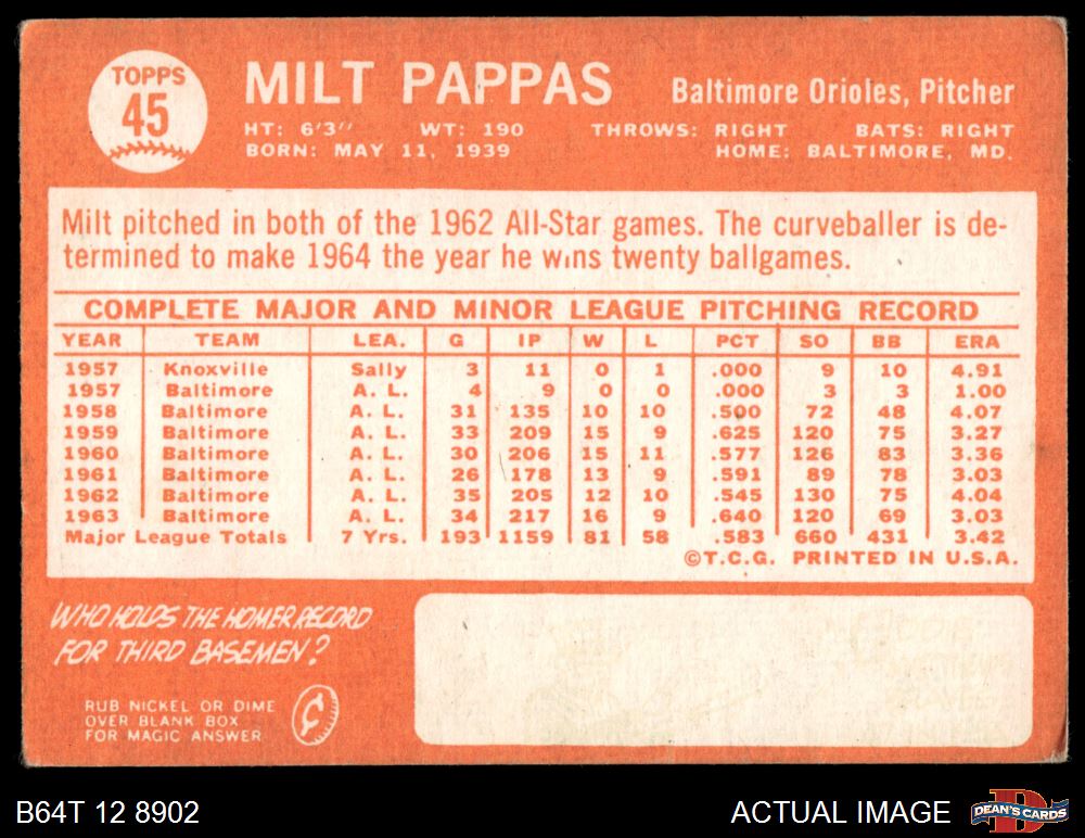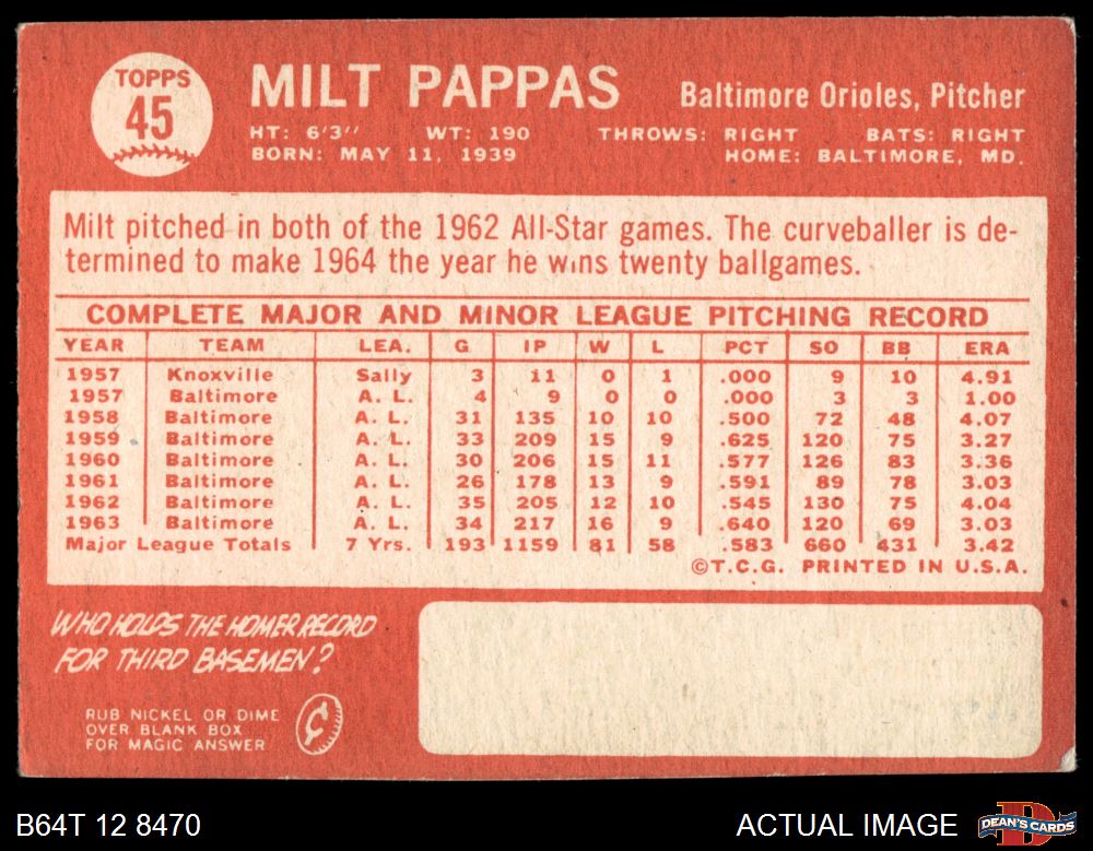 1964 Topps #45 Milt Pappas 3 - VG