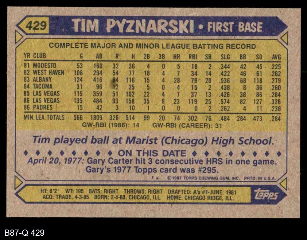1987 Topps #429 Tim Pyznarski 8 - NM/MT