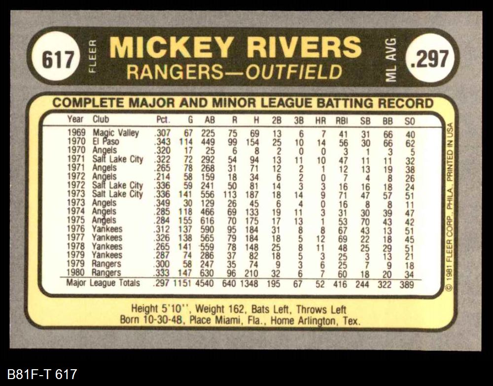 1981 Fleer #617 Mickey Rivers