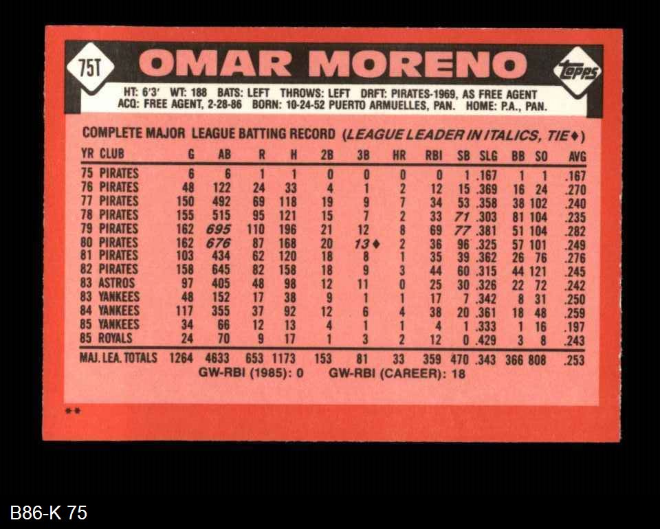 1986 Topps Traded #75 T Omar Moreno 8 - NM/MT