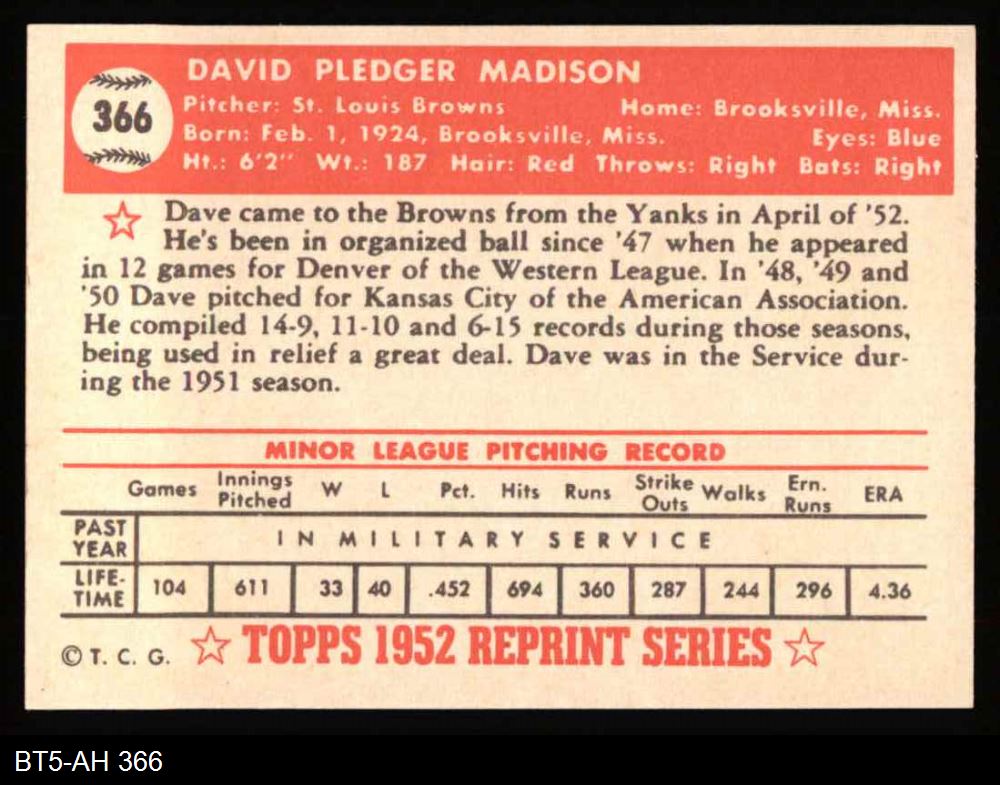 1952 Topps REPRINT #366 Dave Madison 8 - NM/MT