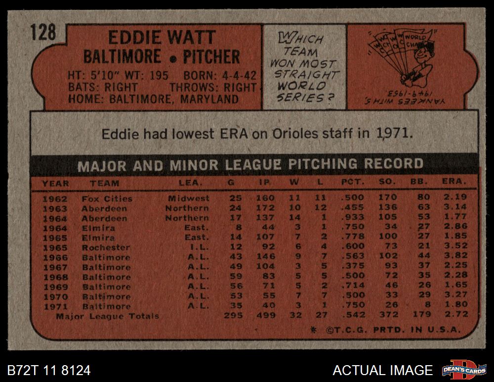 1972 Topps #128 Eddie Watt 4 - VG/EX
