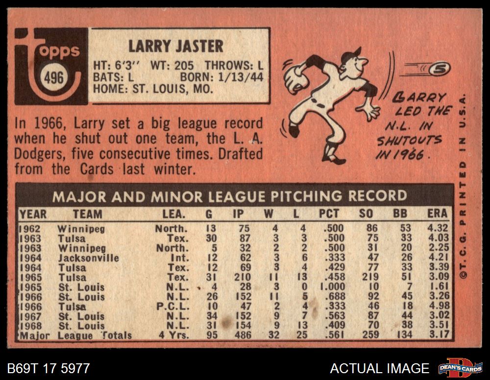 1969 Topps #496 Larry Jaster 4 - VG/EX