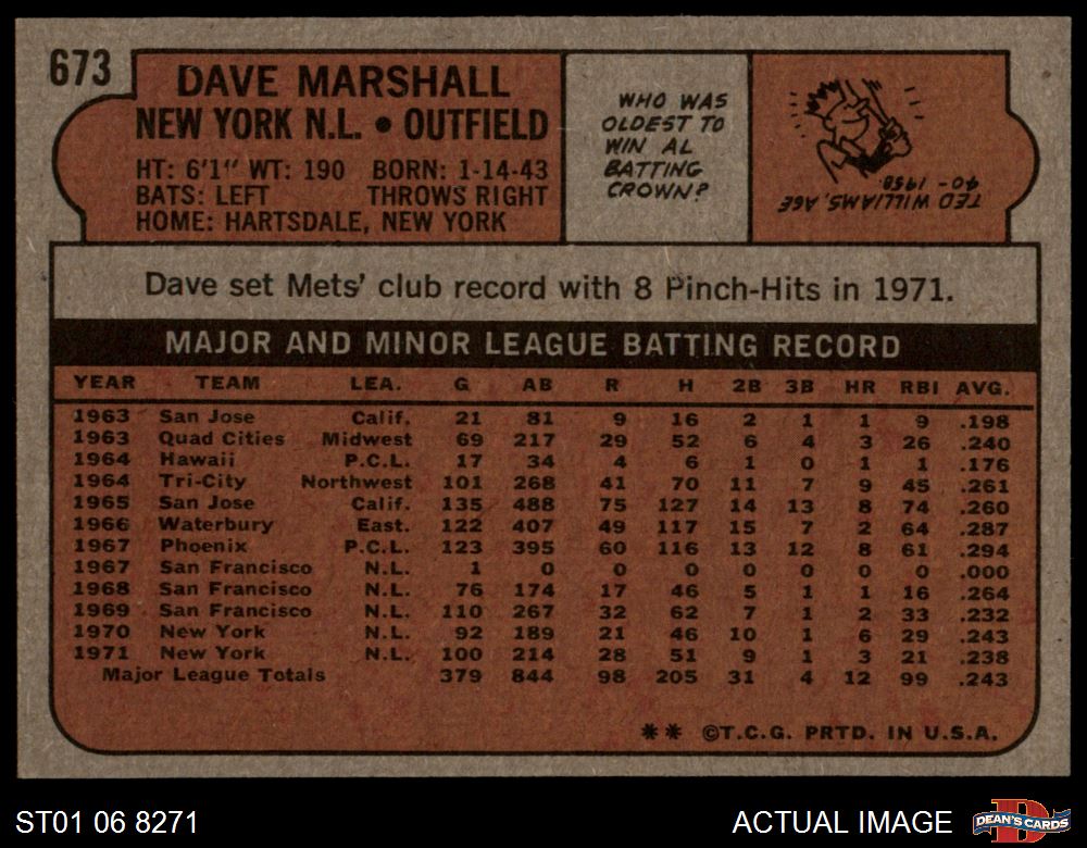 1972 Topps #673 Dave Marshall 6 - EX/MT