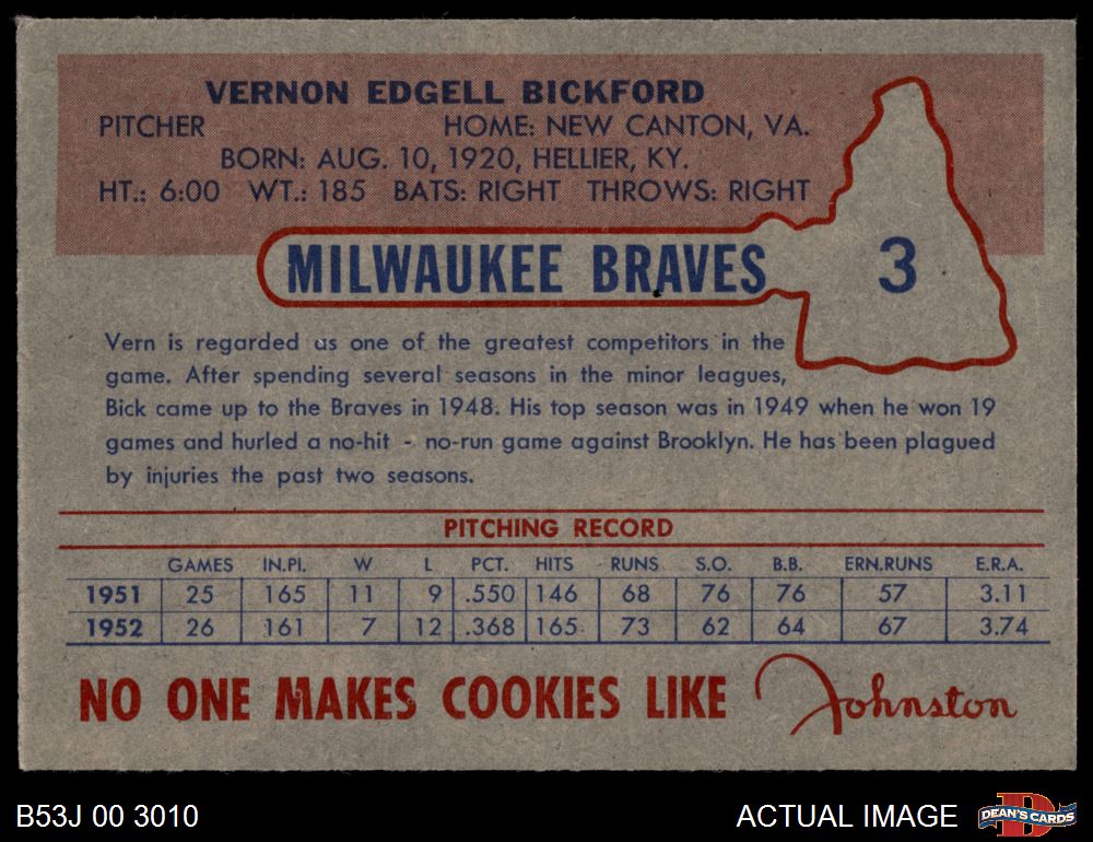 1953 Johnston Cookies #3 Vern Bickford 5 - EX