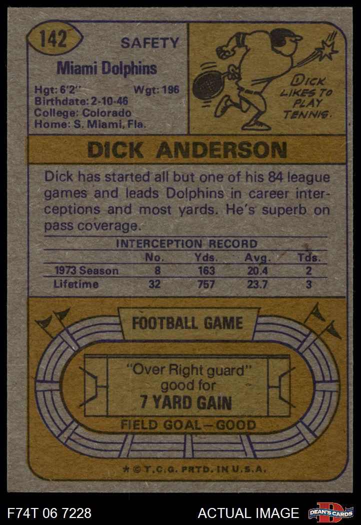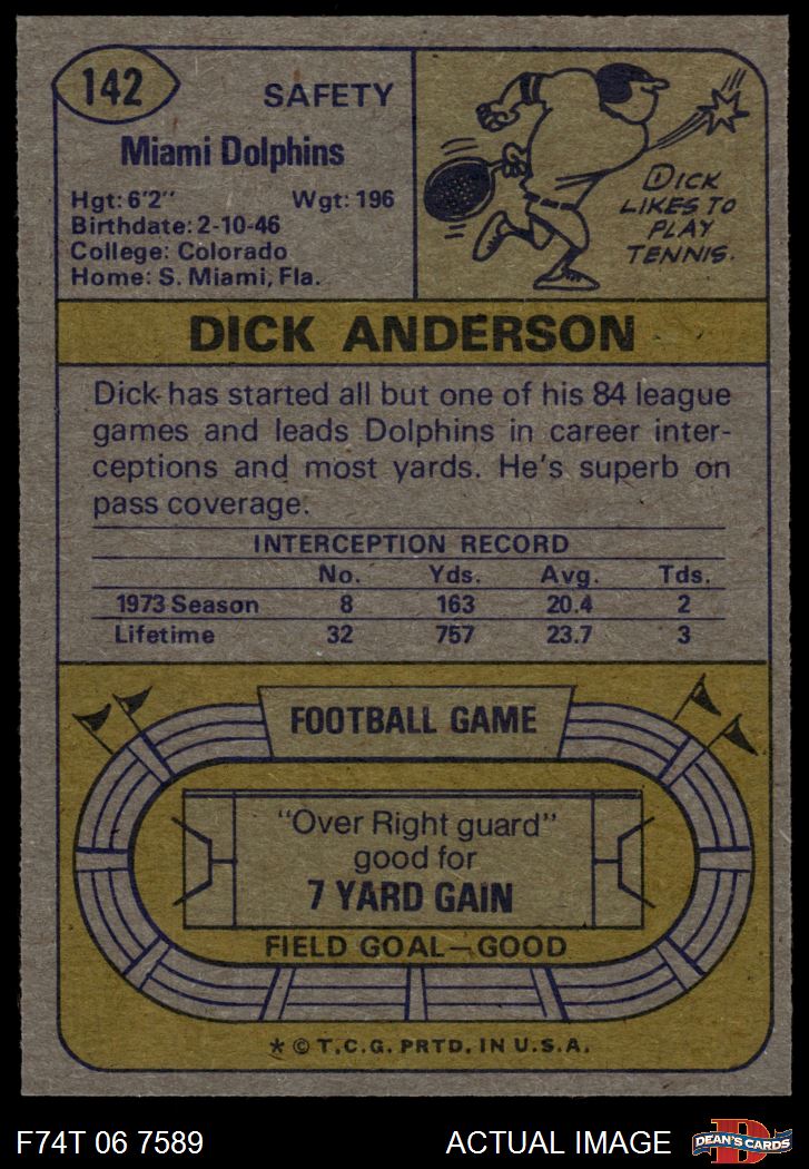 1974 Topps #142 - Dick Anderson All-Pro 6 - EX/MT