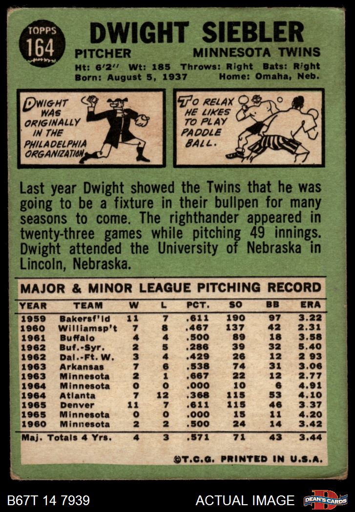 1967 Topps #164 Dwight Siebler 1.5 - FAIR