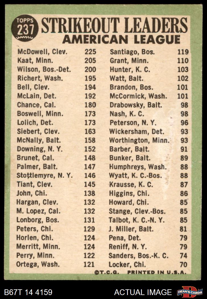1967 Topps #237 - Jim Kaat / Sam McDowell / Earl Wilson AL Strikeout Leaders 2 - GOOD