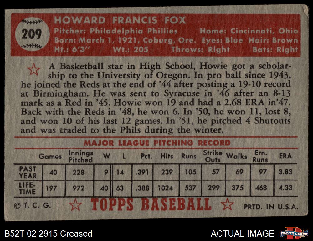 1952 Topps #209 Howard Fox 2 - GOOD