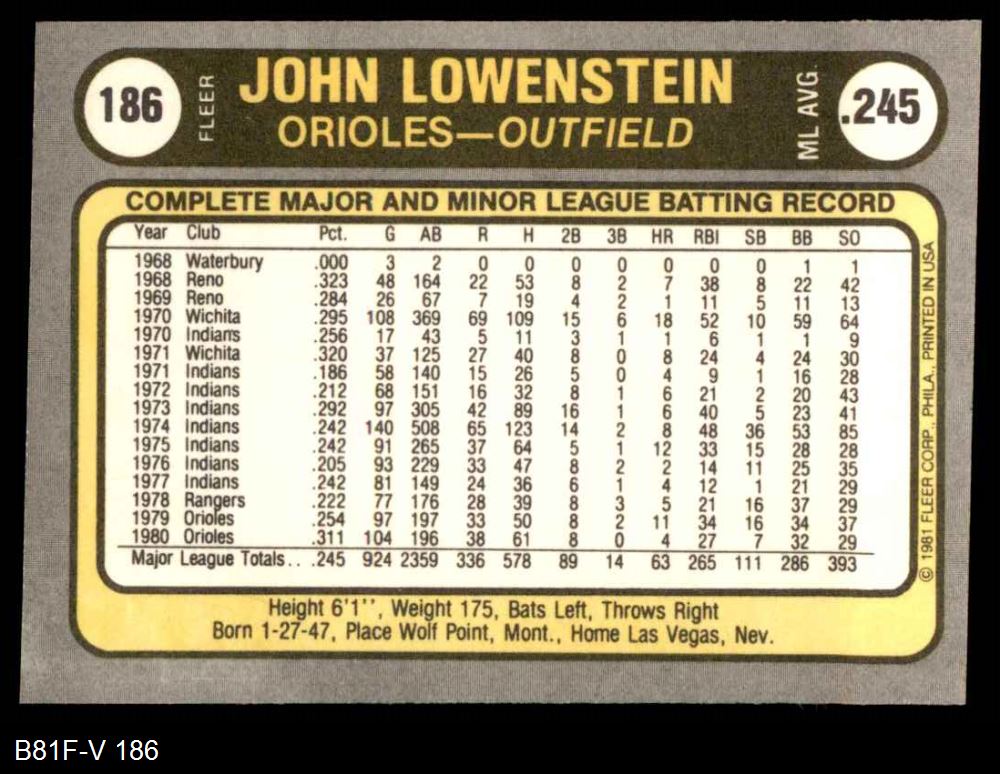 1981 Fleer #186 John Lowenstein 8 - NM/MT