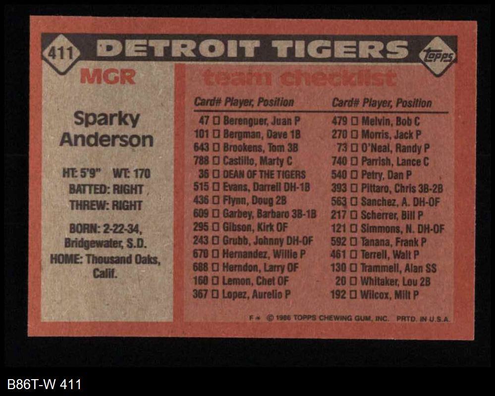 1986 Topps #411 - Sparky Anderson Tigers Team Checklist 8 - NM/MT