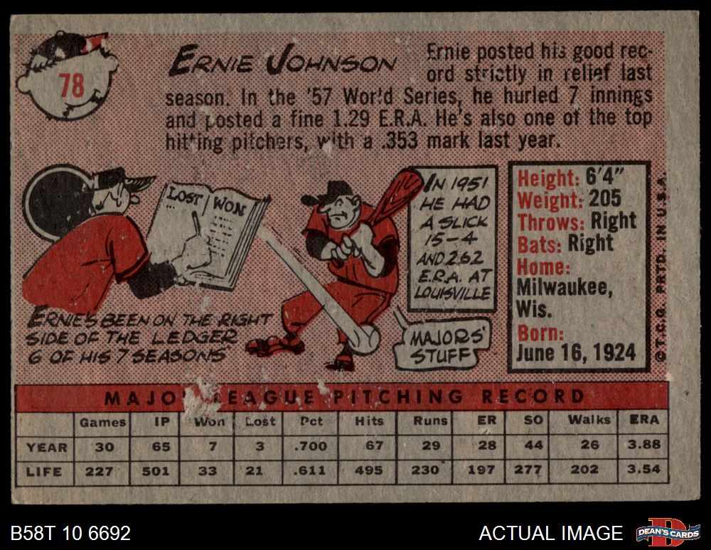 1958 Topps #78 WN Ernie Johnson 2 - GOOD