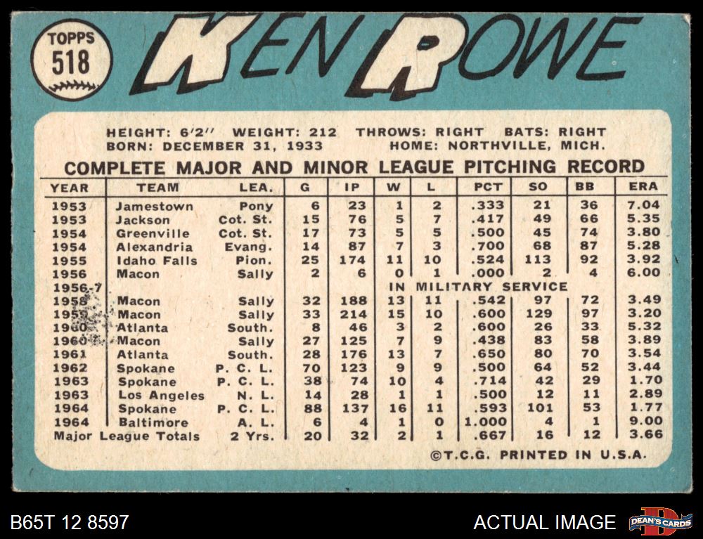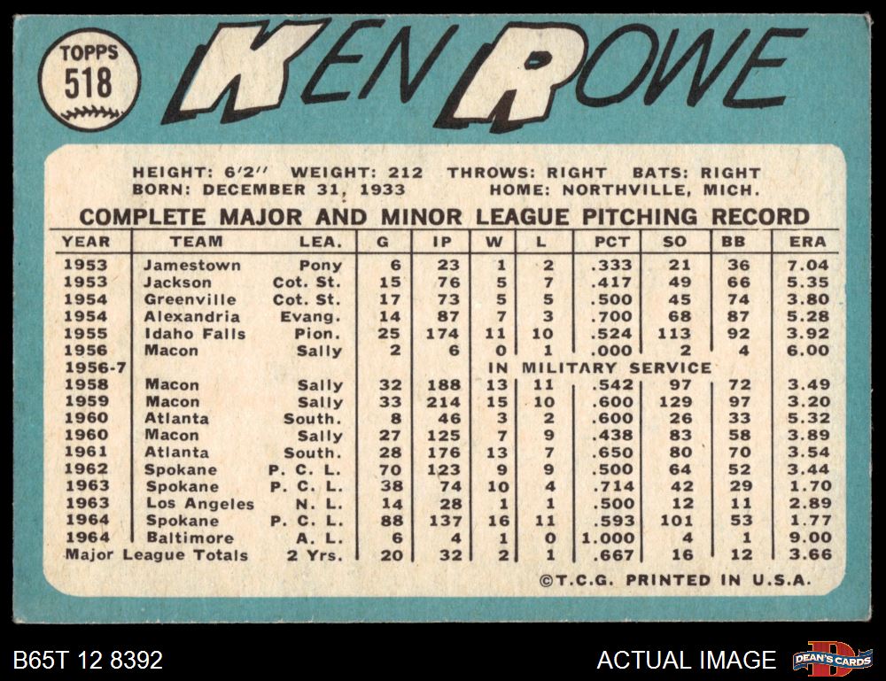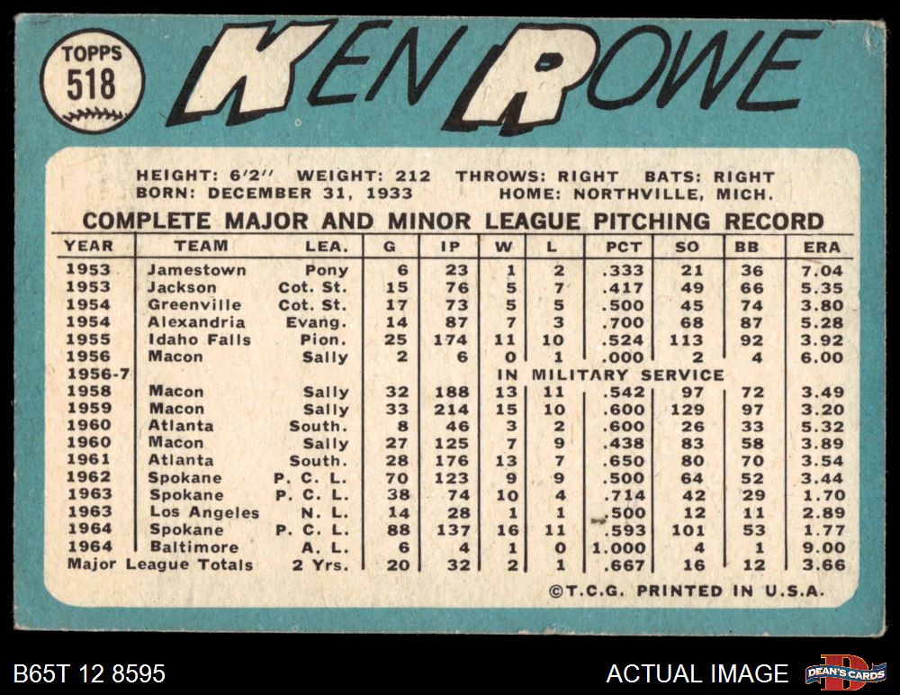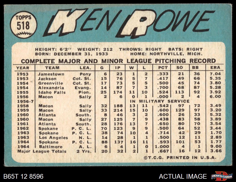 1965 Topps #518 Ken Rowe 3 - VG