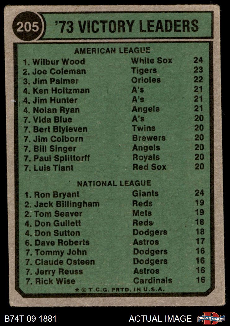 1974 Topps #205 - Wilbur Wood / Ron Bryant Pitching Leaders 2 - GOOD