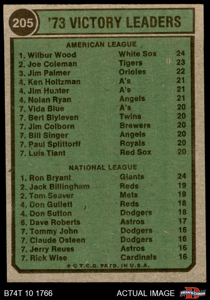1974 Topps #205 - Wilbur Wood / Ron Bryant Pitching Leaders 4 - VG/EX