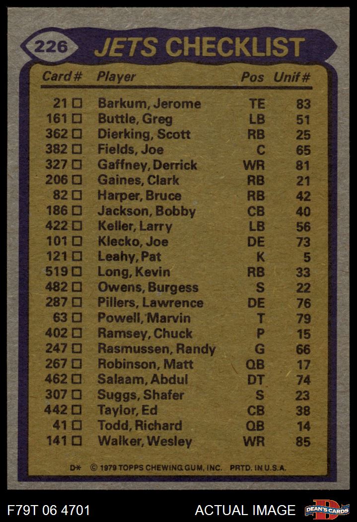 1979 Topps #226 - Kevin Long / Wesley Walker / Bobby Jackson / Joe Klecko / Burgess Owens Jets Team Leaders & Checklist 6 - EX/MT