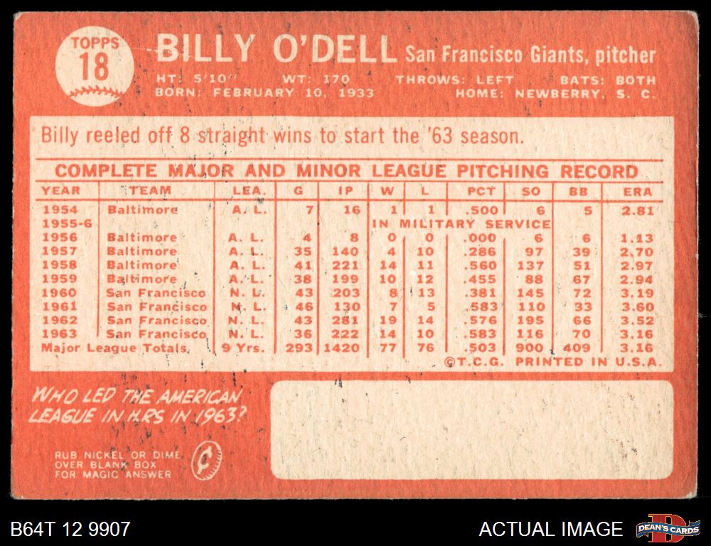 1964 Topps #18 Billy O'Dell 2 - GOOD