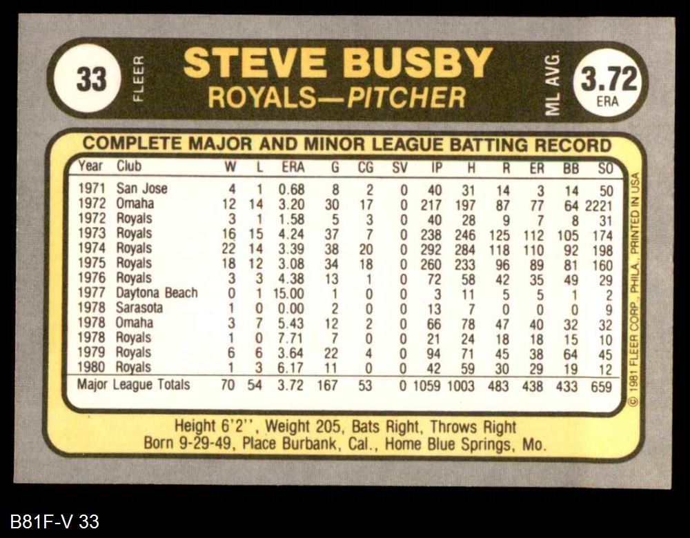 1981 Fleer #33 Steve Busby 8 - NM/MT