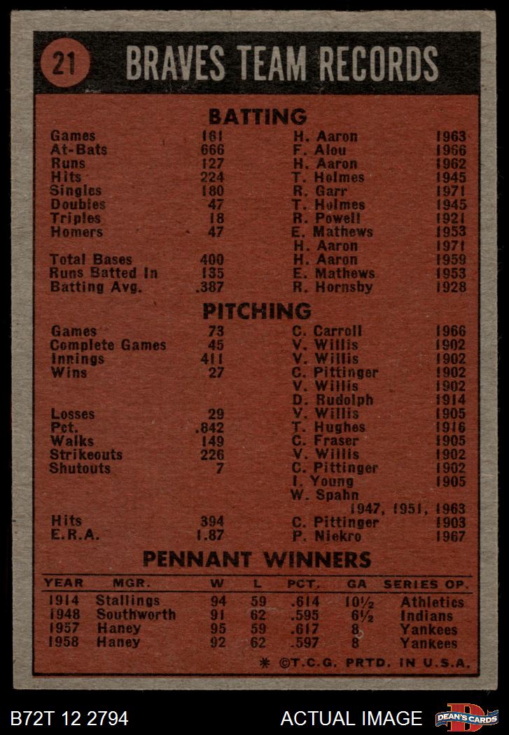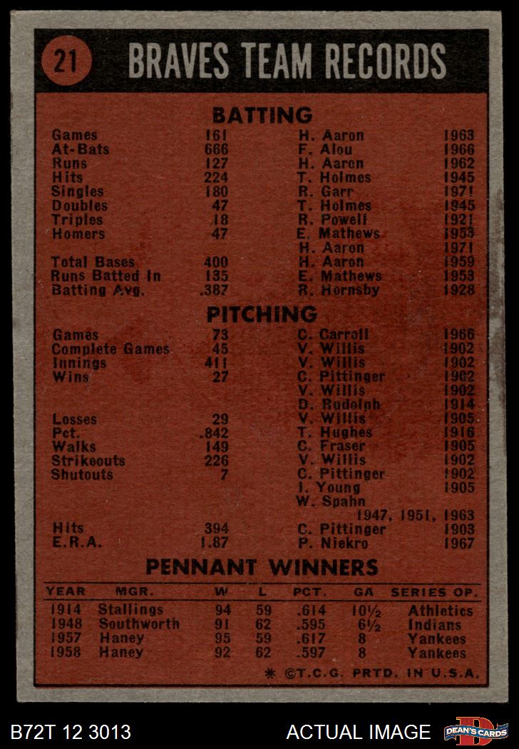 1972 Topps #21 Braves Team 3 - VG