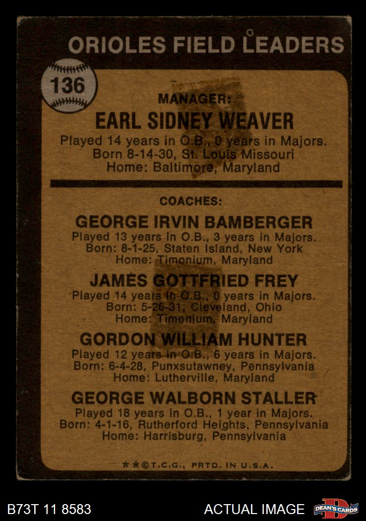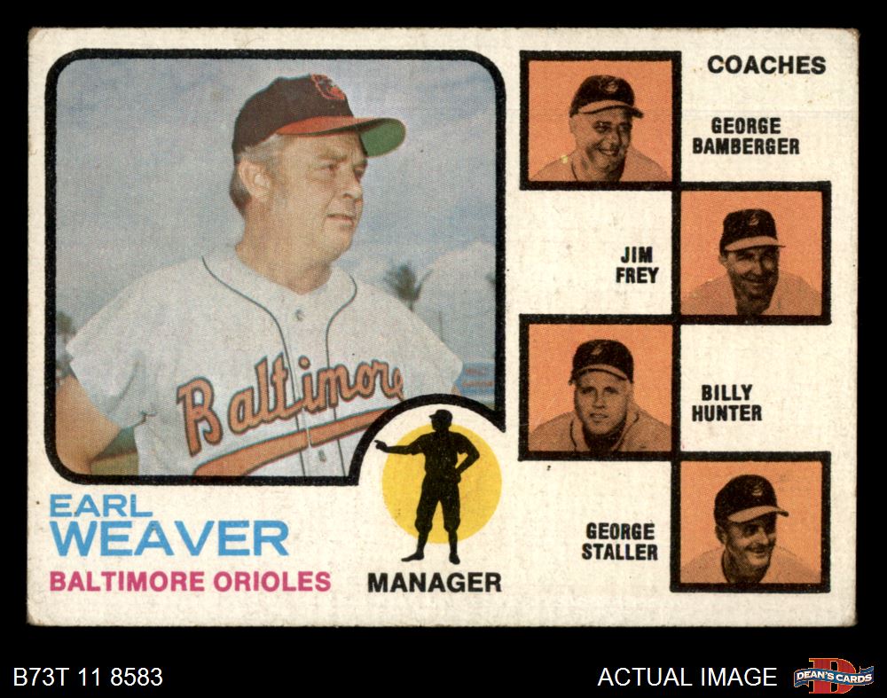 1973 Topps #136 PAR - Earl Weaver / George Bamberger / Jim Frey / Billy Hunter / George Staller Orioles Leaders 1.5 - FAIR