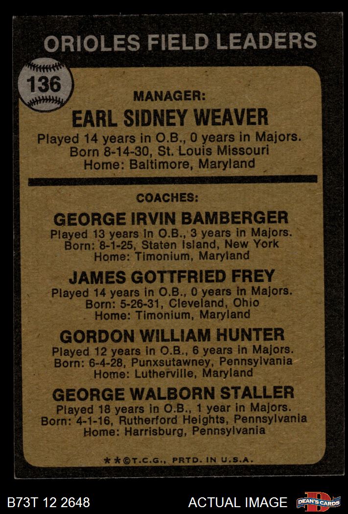 1973 Topps #136 PAR - Earl Weaver / George Bamberger / Jim Frey / Billy Hunter / George Staller Orioles Leaders 2 - GOOD
