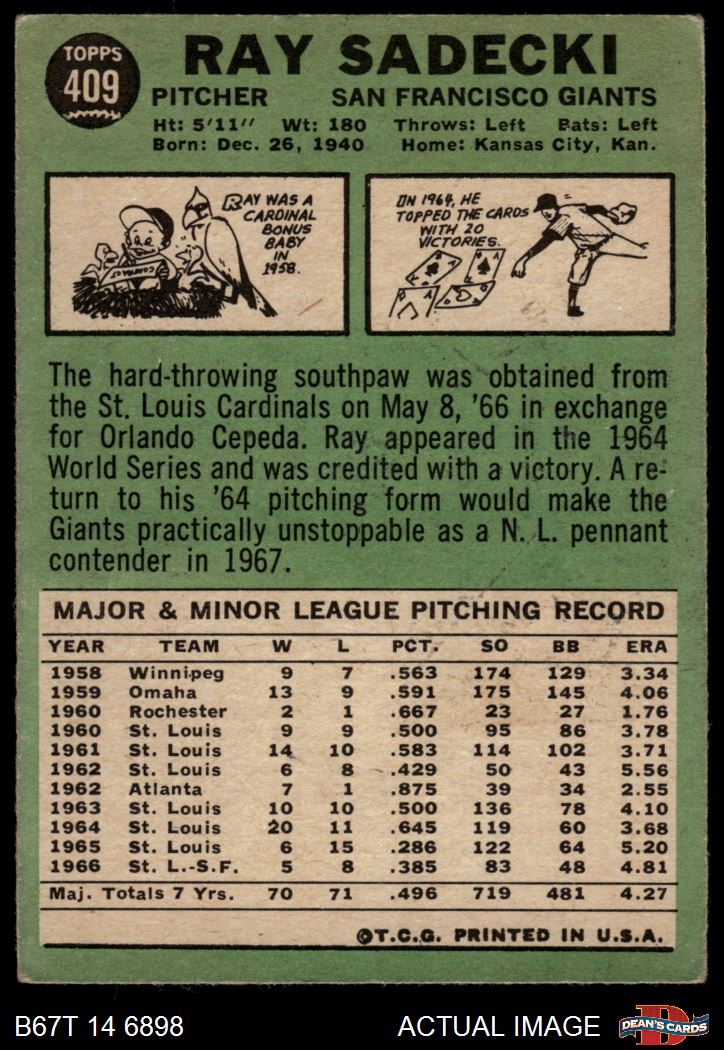 1967 Topps #409 Ray Sadecki 2 - GOOD