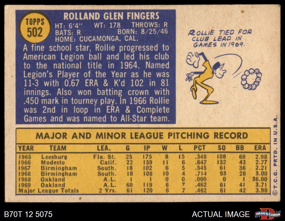 1970 Topps #502 Rollie Fingers 4 - VG/EX