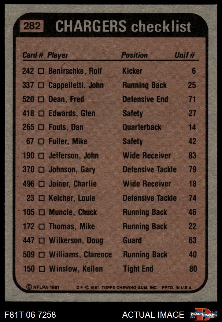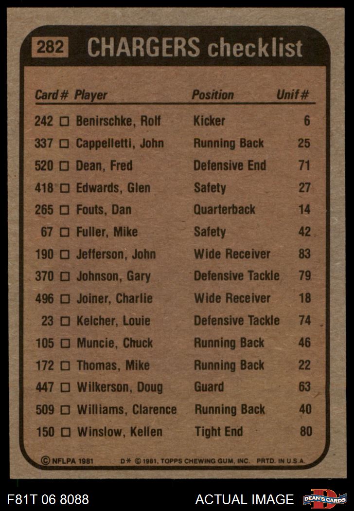 1981 Topps Football Cards (6,377 available)1981 Topps Chargers (203 available)