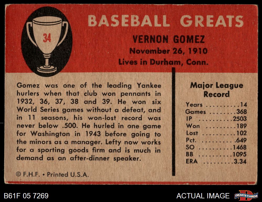 1961 Fleer #34 Lefty Gomez 3.5 - VG+