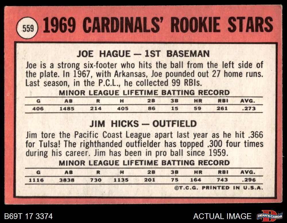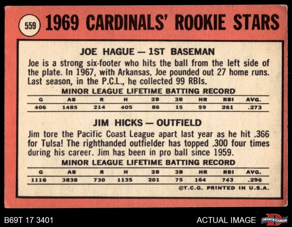 1969 Topps #559 - Joe Hague / Jim Hicks Cardinals Rookies 3 - VG