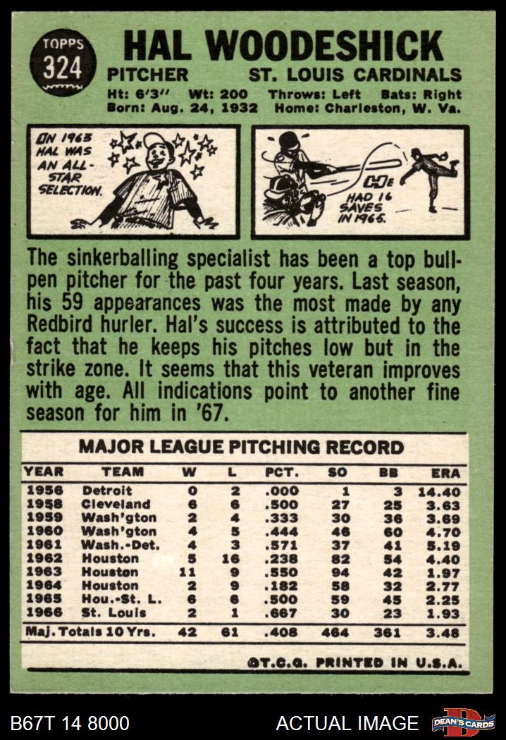 1967 Topps #324 Hal Woodeshick 4 - VG/EX