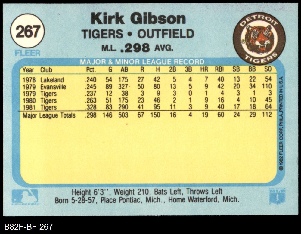1982 Fleer #267 Kirk Gibson 8 - NM/MT