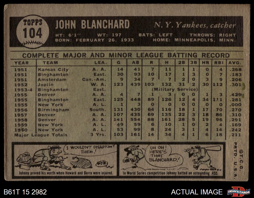 1961 Topps #104 John Blanchard 1.5 - FAIR
