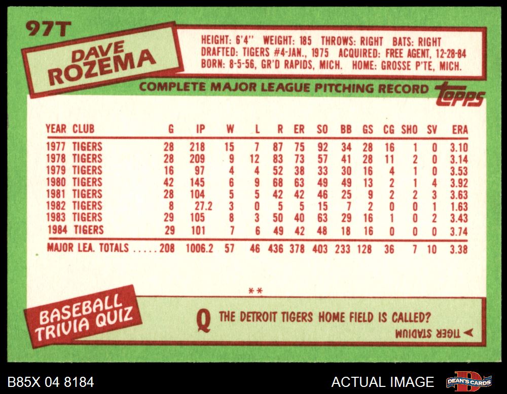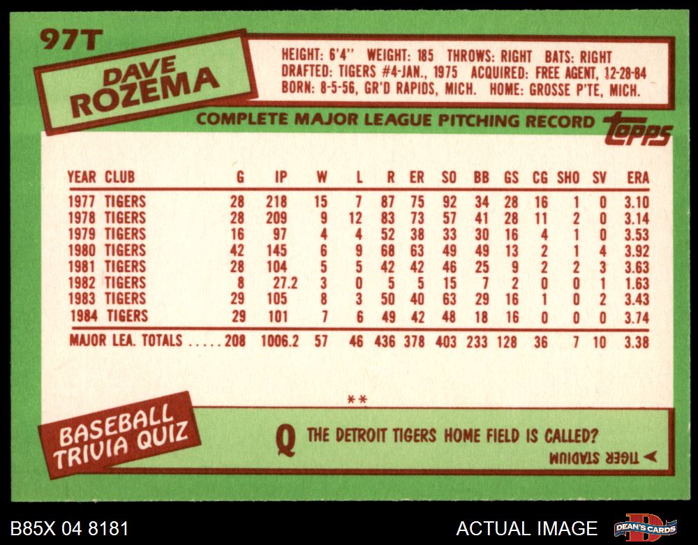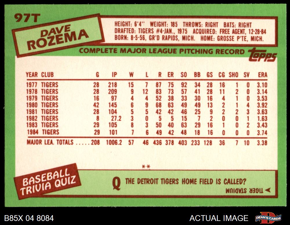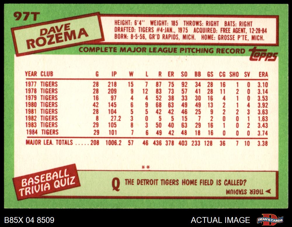 1985 Topps Traded #97 T Dave Rozema
